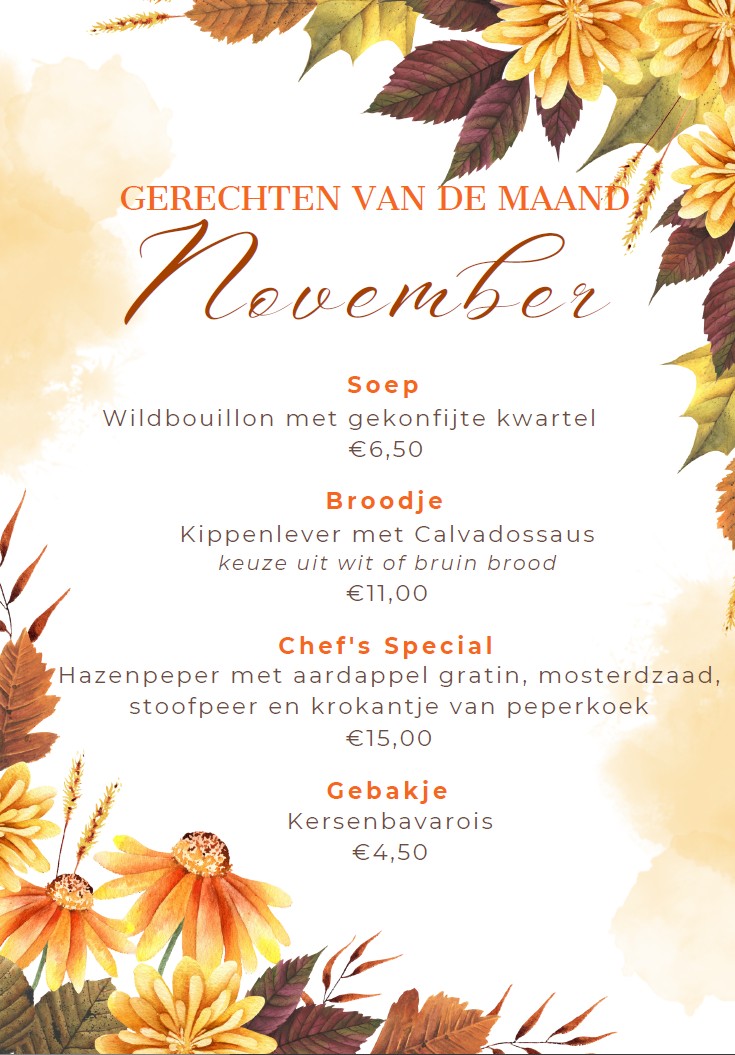Houd wel de openingstijden in de gaten, want we willen niet dat je voor een gesloten deur staat. Lunch serveren we vanaf 11:30 uur.
